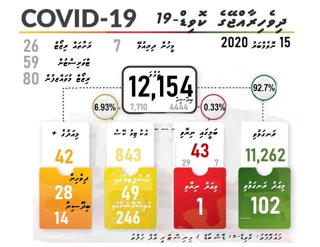 މިހަފުތާގެ ހުކުރު ދުވަހުގެ ނިޔަލަށް މުޅި ރާއްޖޭގައި ކޮވިޑް-19 ޖެހިފައިވާ ކަމަށް ރެކޯޑް ކުރެވިފައި ވަނީ 12,154 މީހުންނެވެ. މީގެ ތެރެއިން %63.8 އަކީ ދިވެހިންނެވެ. އެއިގެ ތެރެއިން 11،262 މީހުން، %92.7 މީހުން ބަލިން ރަނގަޅުވެ، 43 މީހަކު ބަލީގައި މަރުވެފައި ވެއެވެ. މިހާރު ބަލީގައި 843 މީހުން ތިބި އިރު އެއިގެ ތެރެއިން 49 މީހުން ތިބީ ހޮސްޕިޓަލުގައި އެނދުމަތިކޮށްފައެވެ. އަދި ބައްޔާއި ގުޅިގެން 246 އެއްހާ މީހުން އައިސޮލޭޓް ކުރެވިފައިވާ ކަމަށް ވެއެވެ.