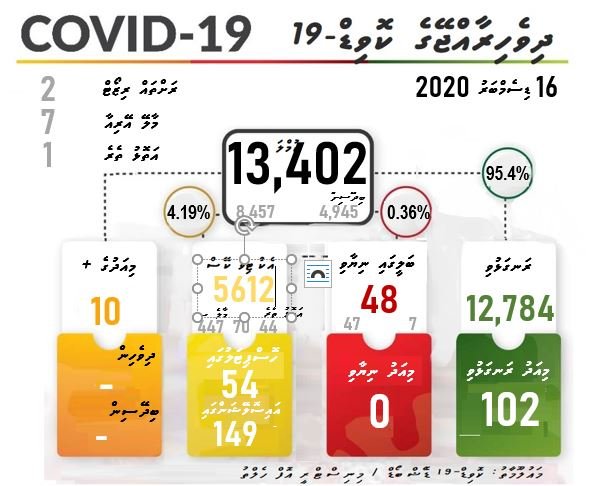 މުޅ ިރާއްޖޭގައިވެސް ވަނީ ކޮވިޑް-19 ވަރަސް ބޮޑަށް ކޮންޓްރޯލް ކުރެވިފައެވެ. އެގޮތުން ފާއިތުވި 2 ދުވަހު މުޅި ރާއްޖެއިން ބައްޔަށް ޕޮޒިޓިވް ވެފައިވަނީ 6 މީހުނާއި 10 މީހުނެވެ.