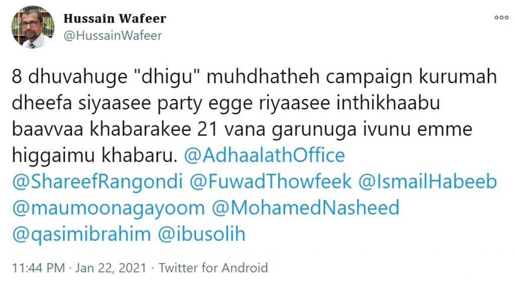 ވަފީރު ހިތްހަމަ ނުޖެހުން ފާޅުކޮށް ނުސީދާކޮށް ފާޑުކިޔާފައިވަނީ މިދިޔަ ހުކުރު ދުވަހު ކުރެއްވި ޓްވީޓެއްގައެވެ. އެ ޓްވީޓުގައި ވަފީރު ބުނެފައި ވަނީ “އަށް ދުވަހުގެ ދިގު މުއްދަތެއް ކެންޕޭނު ދީފައި ސިޔާސީ ޕާޓީއެއްގެ ރިއާސީ އިންތިޚާބު ބާއްވާ ޚަބަރަކީ 21 ވަނަ ގަރުނުގަ އިވުނު އެންމެ ހިތްގައިމު ޚަބަރު” ކަމަށެވެ.