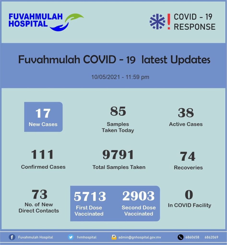 ފުވައްމުލަކު ހޮސްޕިޓަލުން ހާމަކޮށްފައިވާ މައުލޫމާތުތަކަށް ބަލާއިރު އިއްޔެ އެހޮސްޕިޓަލުން 85 ސާމްޕަލް ނަގާފައިވެއެވެ. އަދި މިހާތަނަށް އެކްޓިވް ކޭސްތަކުގެ ގޮތުގަިއ ތިބީ 38 ކޭސްއެކެވެ. އަދި 74 މީހަކު މިރޯގާއިން މިހާތަނަށް ފަސޭހަވެފައިވެއެވެ. ފެސިލިޓީގައި އެއްވެސް މީހަކު ނެތް ނަމަވެސް، ފުވައްމުލަކު ސިޓީއަށް އައި ކޮވިޑް ދެވަނަ ރާޅާއިއެކު ބަލީގެ ސިމްޓަމް ފެންނަ މީހުން ގިނައެވެ. އަދި އެޗްޕީއޭގެ މައުލޫމާތަށް ބަލާއިރު ވެކްސިން ގެ ދެ ޑޯޒު ފުރިހަމަކޮށްފައިފައި އެއްވެސް މީހަކު މިހާތަނަށް ވެންޓިލޭޓަރަށް ލާންޖެހޭ ހާލަތަކަށް ނުދެއެވެ. އަދި ފެސިލިޓީތަކުގައި މިހާރު 40 އަހަރުން ދަށުގެ މީހުން ތިބިއިރު ގިނައިން ތިބީ ވެކްސިން ނުޖަހާ ނުވަތަ ދެޑޯޒު ފުރިހަމަ ނުކުރާ ފަރާތްތަކެވެ. އެހެންކަމުން އަލުން ވެކްސިން ދިނުން މިވަނީ މާލެ އާއި ފުވައްމުލަކުގައި ވެސް ކުރިއަށް ގެންގޮސްފައެވެ.