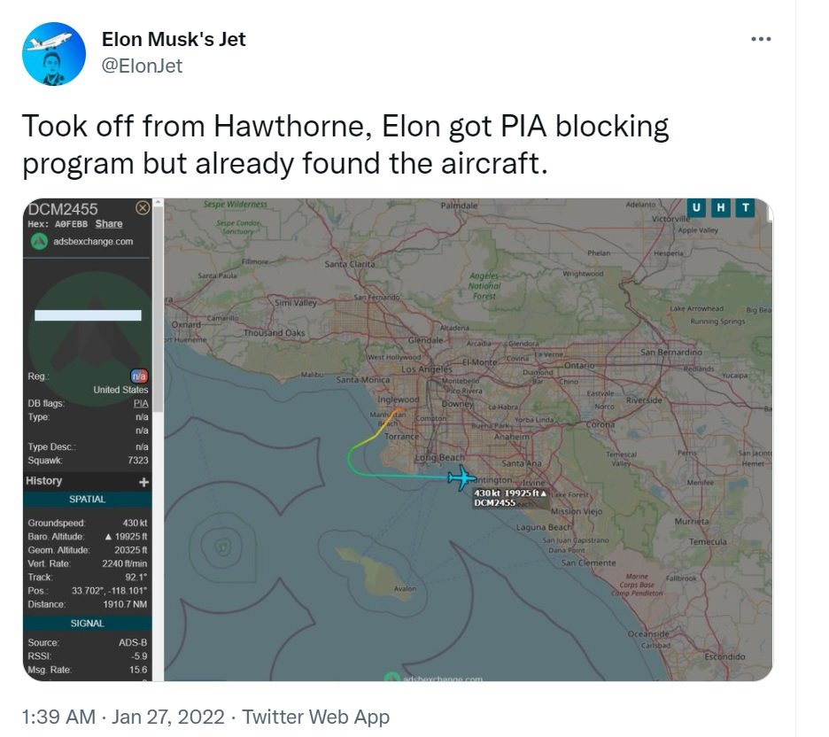 ޓެސްލާ އާއި ސްޕޭސްއެކްސްގެ ވެރިޔާ މަހުޖަނު އެލޮން މަސްކް އޭނާގެ ޕްރައިވެޓް ޖެޓް ޓްރެކްކުރި ޓްވިޓާ އެކައުންޓް ޑިލީޓްކުރުމަށް އެއެކައުންޓް ގެންގުޅޭ ޖެކް ސްވީނީ އަށް ހުށަހެޅި ކަމަށް ސީއެންއެން އިން ރިޕޯޓްކޮށްފިއެވެ. އެލޮން މަސްކް ދަތުރުކުރާ ޕްރައިވެޓް ޖެޓް ޓްރެކްކޮށް ފީޑް އަޕްލޯޑް ކުރުމަށް ފްލޮރިޑާގެ 19 އަހަރުގެ ޅަޒުވާން ސްވީނީ ބޭނުންކުރި ޓްވިޓާ އެކައުންޓް އެއްލައްކަ ފަންސާސްހާސް މީހުން ފޮލޯ ކުރެއެވެ.