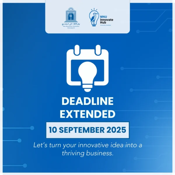 ދިވެހިރާއްޖޭގެ ޤައުމީ ޔުނިވާސިޓީ (އެމް.އެން.ޔޫ)ގެ ފަރާތުން ކުރިއަށްގެންދިޔުމަށް ހަމަޖެހިފައިވާ “އެމް.އެން.ޔޫ އިނޮވޭޓިވް ހަބް” ގައި ބައިވރިވުމުގެ ސުންގަނޑި 10 ސެޕްޓެމްބަރ 2025 ވާ ބުދަ ދުވަހަށް އިތުރުކޮށްފިއެވެ.