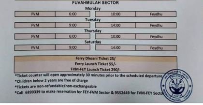 މޯލްޑިވްސް ޕޯރޓްސް ލިމިޓެޑް (އެމްޕީއެލް) އިން ކުރިއަށް ގެންދާ މިފެރީ ދަތުރު ތަކުގައި ޓިކެޓް ގަތުމަށް ގުޅުމަށް ދީިފައިވާ ނަމްބަރަކީ، 6899339 އާއި 9552448 އެވެ. އަދި ޓިކެޓްގެ އަގަކީ ކޮޅަކަށް 290 ރުފިޔާއެވެ. ކުޑަކުދިންނަށް (2 އަހަރުން ދަށް) ބެލެނިވެރިއަކާއެކު ހިލޭ ދަތުރުކުރެއެވެ.