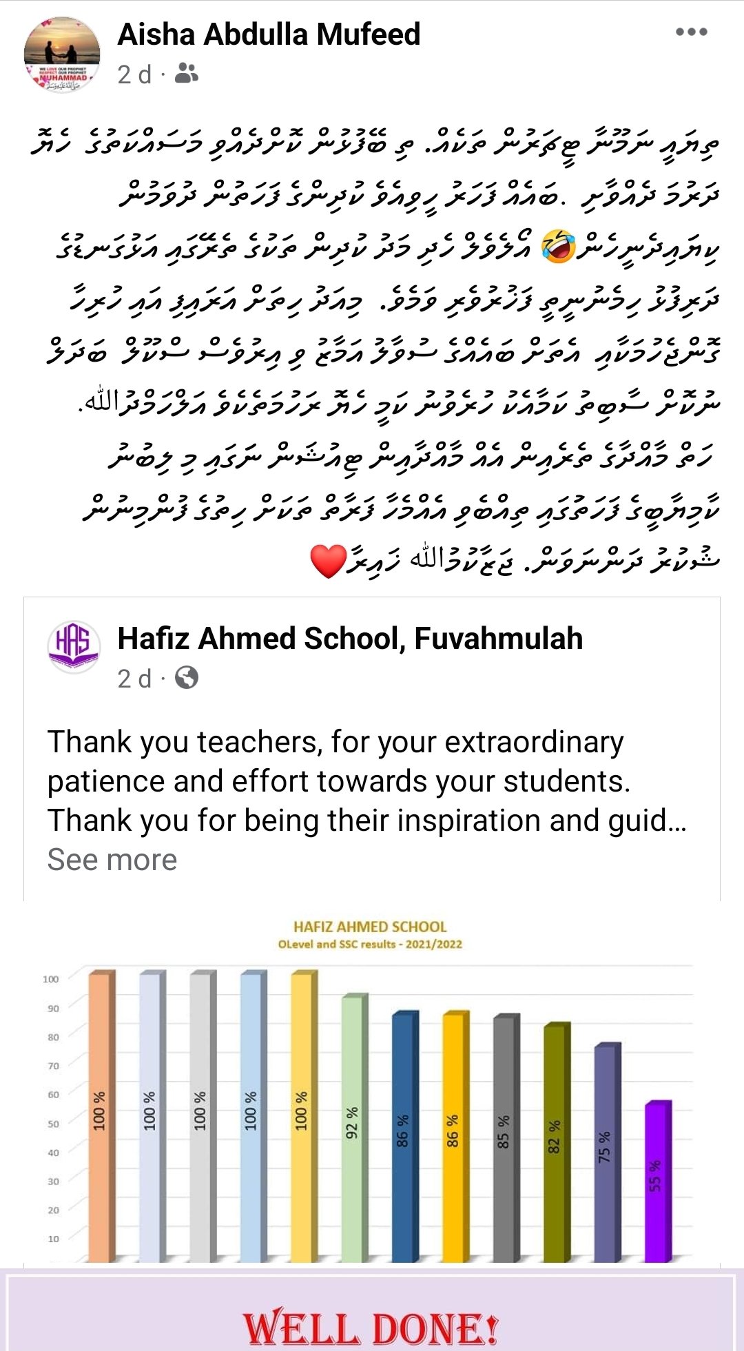 ހޭޒްގެ ބިޒިނަސް ހުރިހާ މާއްދާއަކުން 100އިންސައްތަ ފާސްވެފައިވާތީ ޓީޗަރުންނަށް ތަހުނިޔާ ކިޔައި ހަދައިފައިވާ ޕޯސްޓަކަށް އެޑިޔުކޭޝަން މިނިސްޓަރު ތަހުނިޔާ ވިދާޅުވެފަ